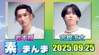 Snow Manの「素のまんま」 Snow Manの「素のまんま」「すのまんま」宮舘涼太,岩本照 2025年09月25日 #すのまんま#すのまんまラジオ#素のまんま ☃️今夜のメンバー☃️ #宮舘涼太 #岩本照 の2人です!お楽しみに!❤️💛 放送中は #素のまんま でポストして一緒に盛り上がりましょう! #SnowMan #素のまんま 2025.09.25 Snow Manの「素のまんま」